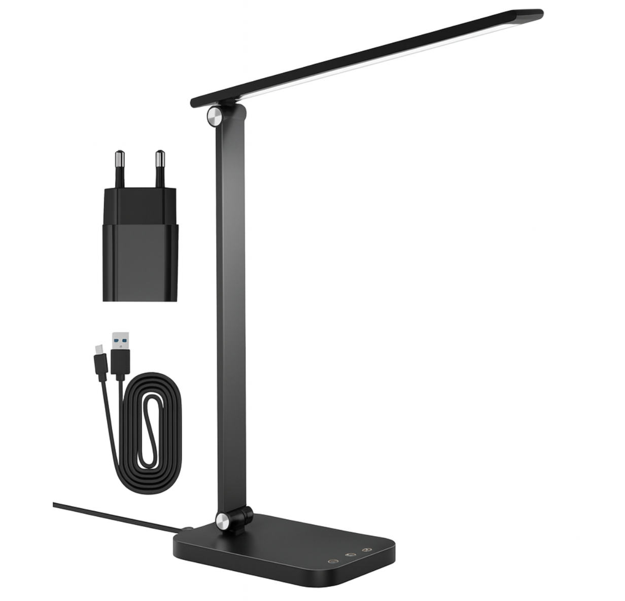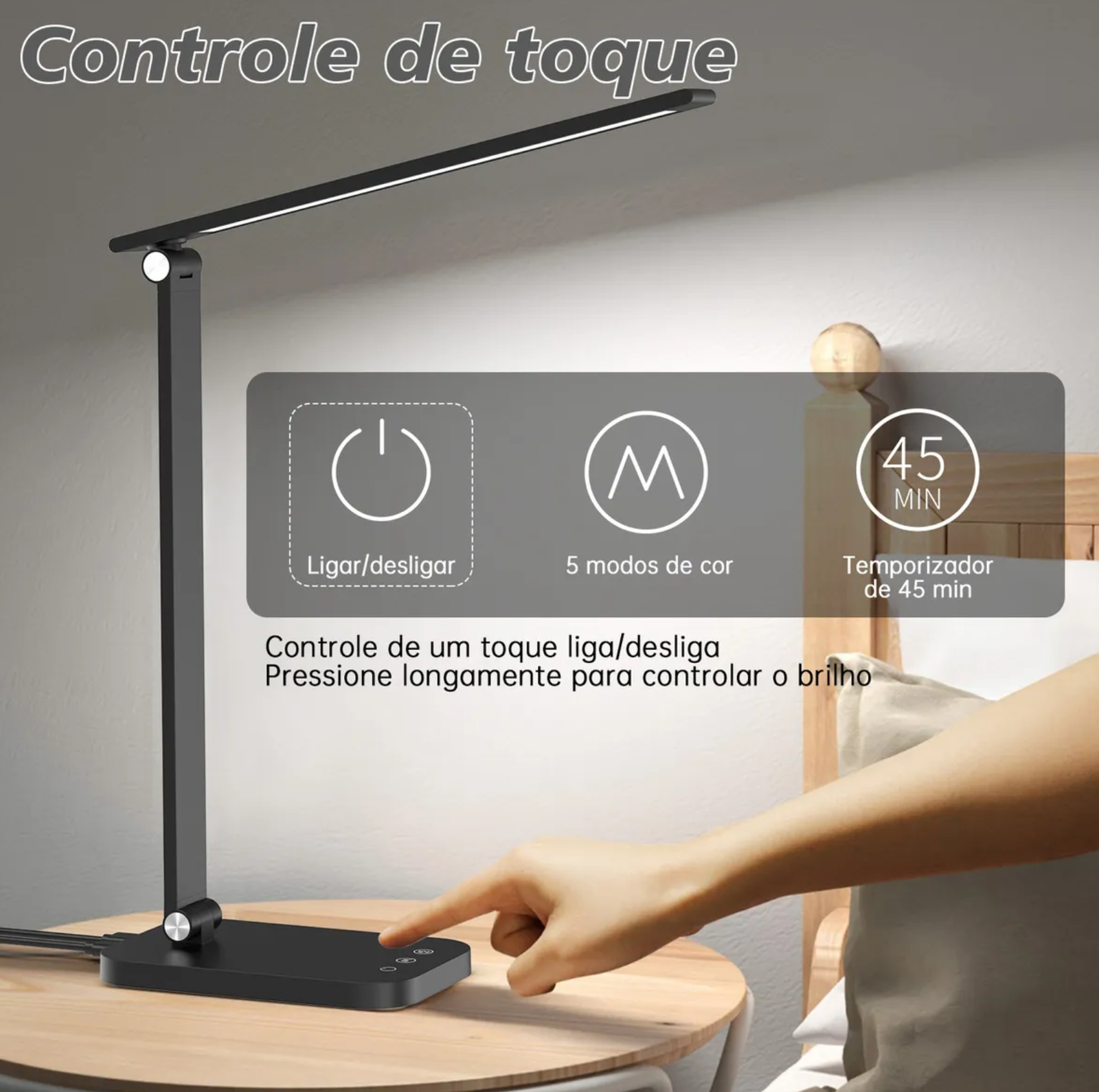 Luminária de mesa ideal para escritório, leitura e estudo. Possui ajuste de iluminação com cinco temperaturas de cor e três níveis de brilho. Pode ser utilizada para leitura, escrita, pintura, artesanato, estudo e atividades que exigem iluminação direta e regulável. O ajuste é feito pelo sensor de toque.