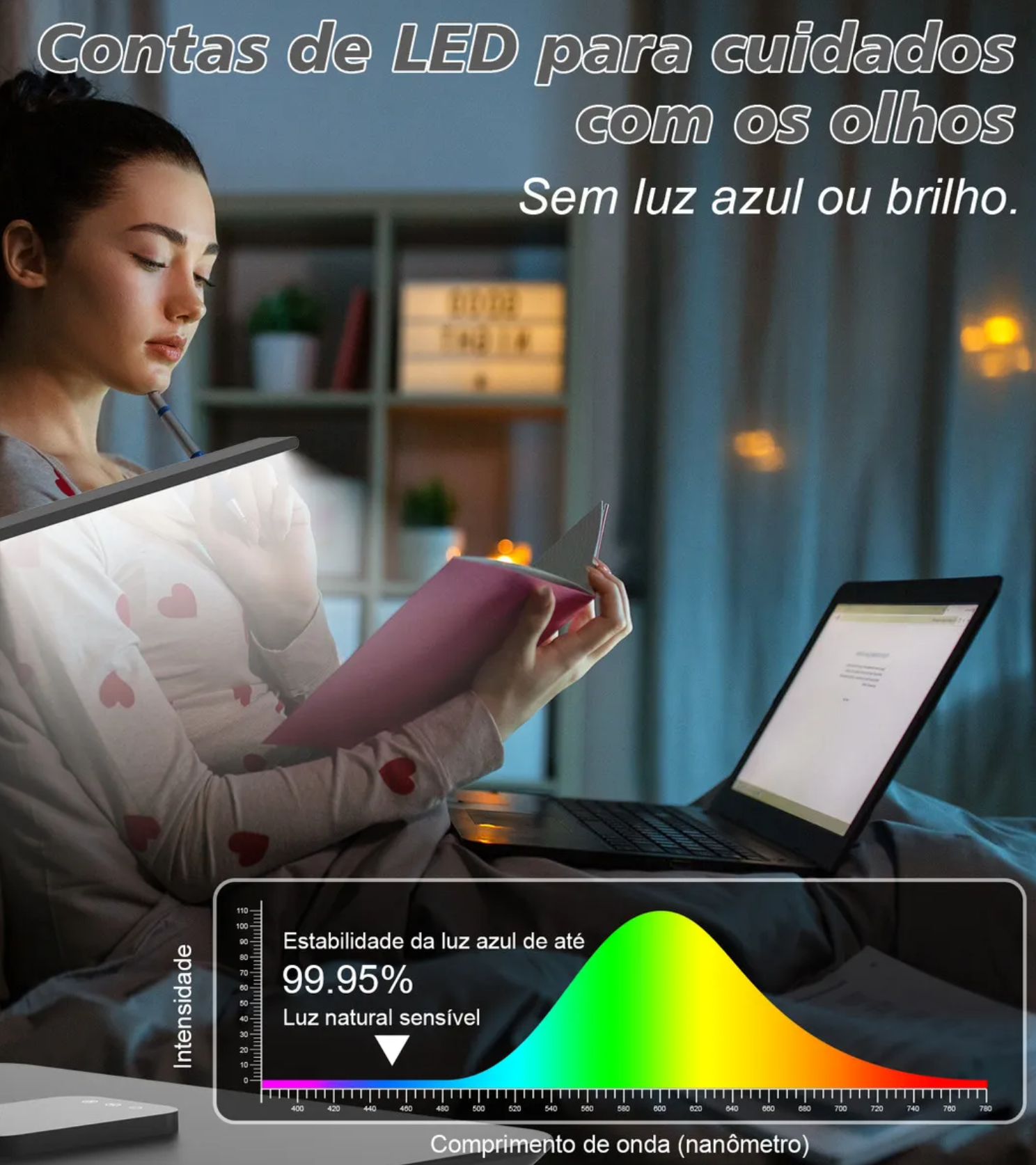 Luz estável, sem cintilação e sem reflexo direto. Contribui para reduzir cansaço visual em períodos prolongados de leitura ou trabalho.