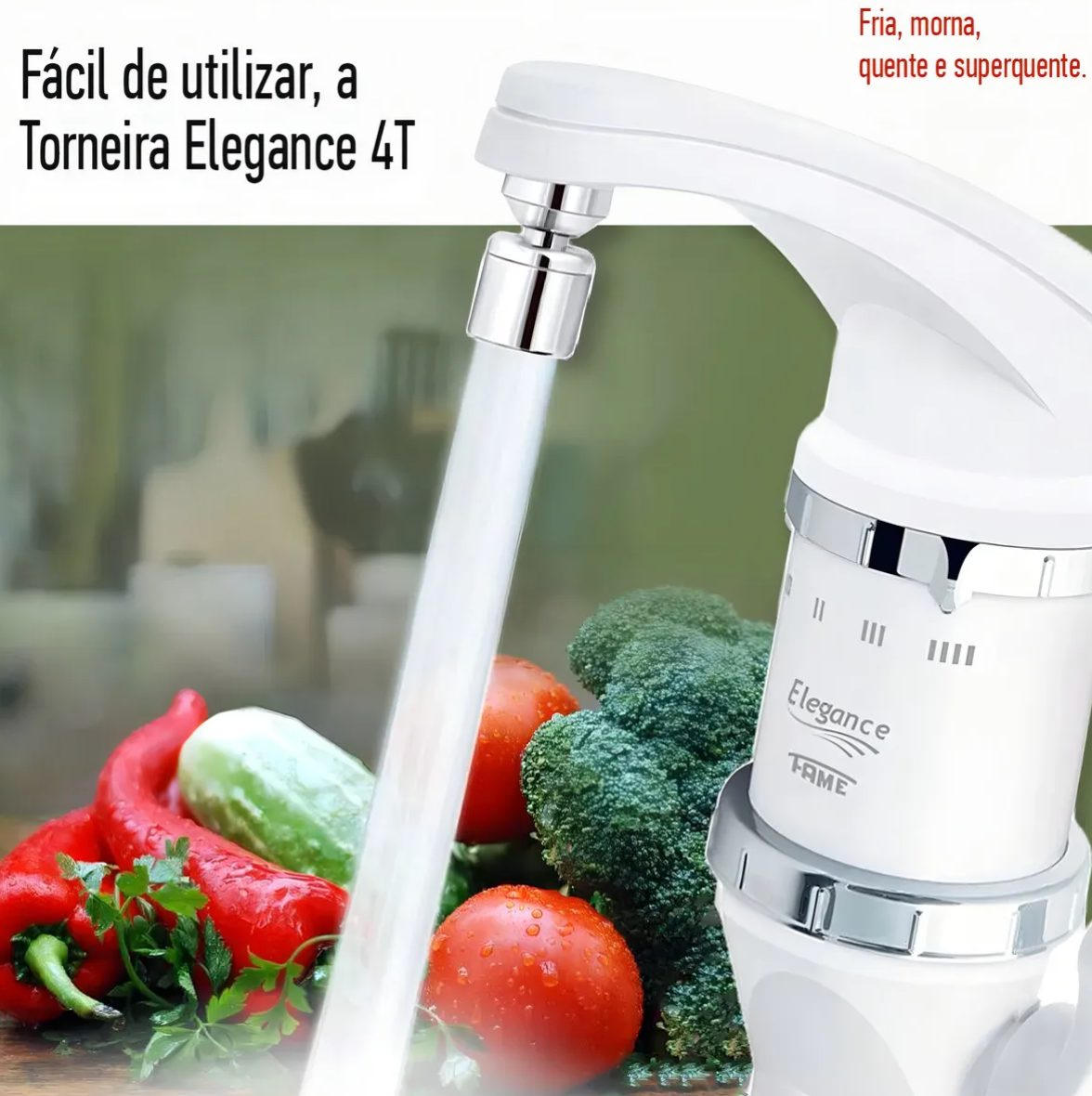 Torneira Elétrica Fame Elegance 4T para bancada, desenvolvida para facilitar as tarefas da cozinha com aquecimento instantâneo de água. O uso de água quente ajuda a remover gordura com mais facilidade, reduz o consumo de detergente e economiza tempo no dia a dia, mantendo boa eficiência energética.